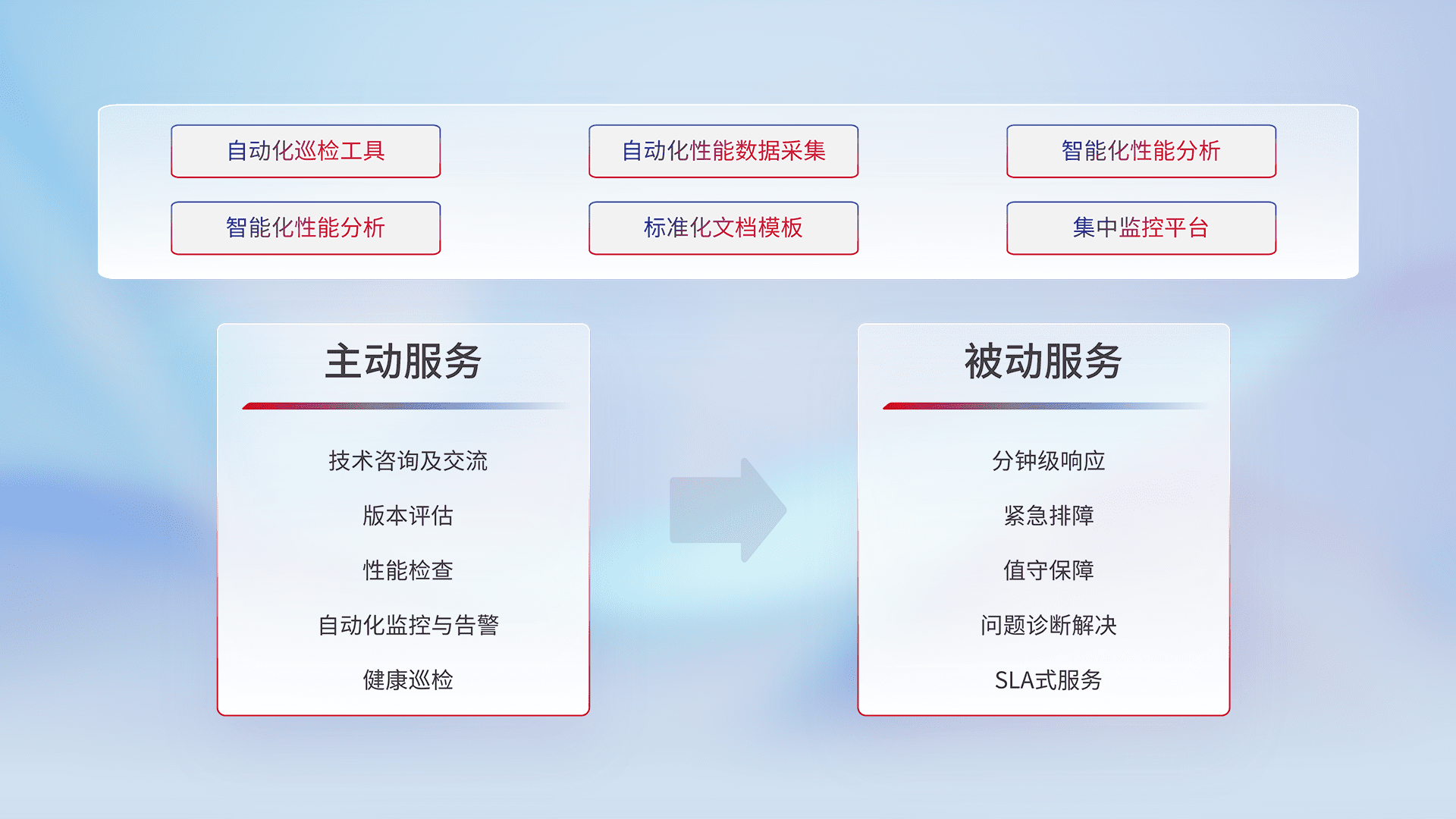 智能化工具和标准化文档,,,,保障服务质量,,,,提供主动服务(包含技术咨询、、、版本评估、、、、性能检查、、自动化监控与告警、、、、健康巡检)和被动服务包含(分钟级响应、、紧急排障、、值守保障、、、问题诊断解决、、、、SLA服务)。。。。